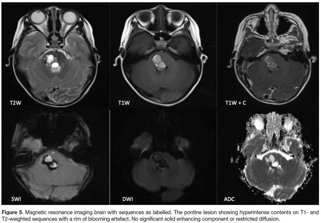 Figure 5. Magnetic resonance imaging brain with sequences as labelled. The pontine lesion showing hyperintense contents on T1- and T2-weighted sequences with a rim of blooming artefact. No significant solid enhancing component or restricted diffusion.