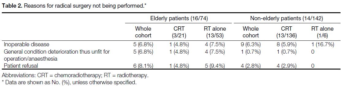 我們分析了74名年老病人及142名非年老病人。年老病人在接受放射治療期間同時進行化學治療的比例較低(p < 0.001)。為所有年齡的病人進行放化療在任何存活終點並沒有出現統計學上的顯著差異。不適合同時接受化學治療的年老病人,其治療毒性發生率較高。年齡並非任何類別存活的重要預後因素。