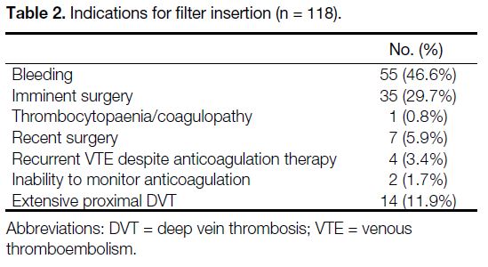 在該118名患者中,濾器置入最常見適應症為抗凝治療導致出血。下腔靜脈濾器平均置留時間為101.7天。一名患者在濾器回取前死亡。濾器回取整體成功率為89.0%。在濾器無法回取的13名患者中,9人需要終生抗凝,4人失訪。三名患者由於濾器回取延遲而出現下肢深靜脈血栓形成。