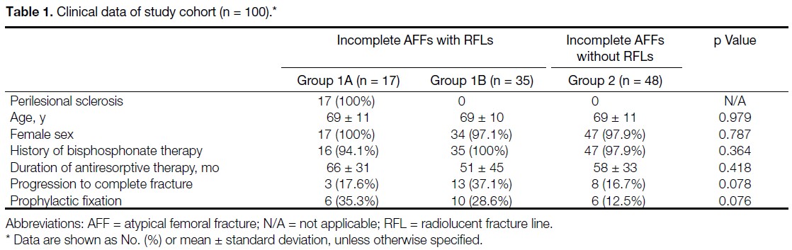 with an RFL and perilesional sclerosis; Group 1B included AFFs with an RFL but without perilesional sclerosis;