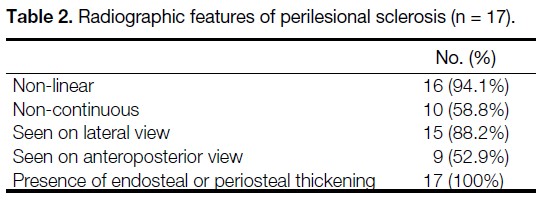 or periosteal thickening. All sclerotic RFLs occurred in patients with a mean age of 69 years. Sixteen cases (94.1%)
