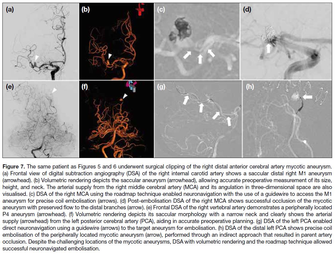occlusion. Despite the challenging locations of the mycotic aneurysms, DSA with volumetric rendering and the roadmap technique allowed