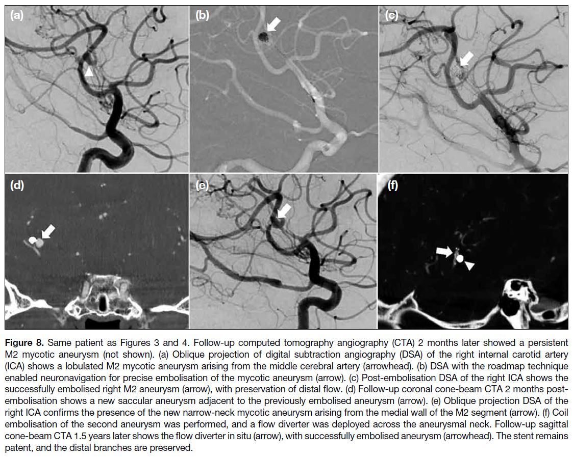 embolisation of the peripherally located mycotic aneurysm (arrow), performed through an indirect approach that resulted in parent artery