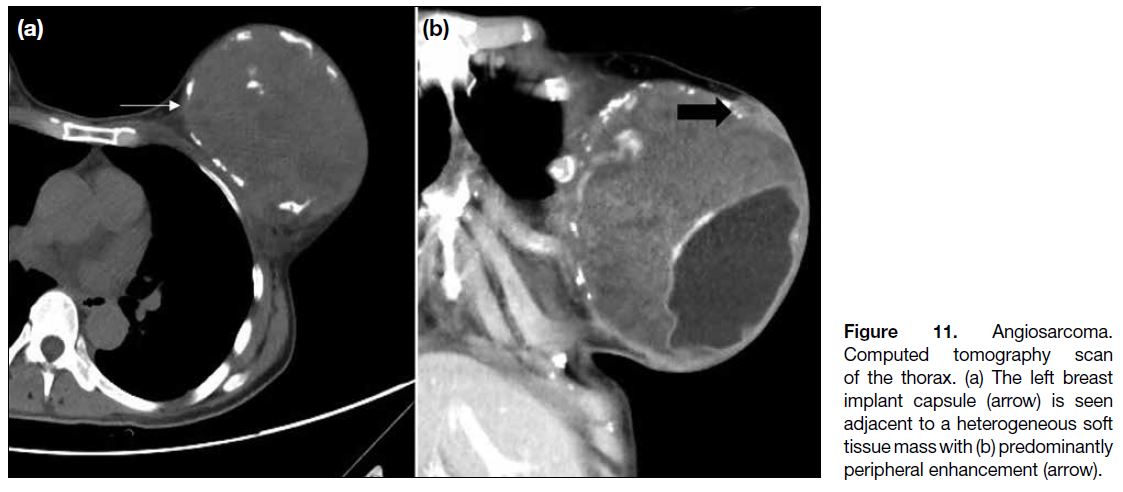 breast implants (thin arrows).