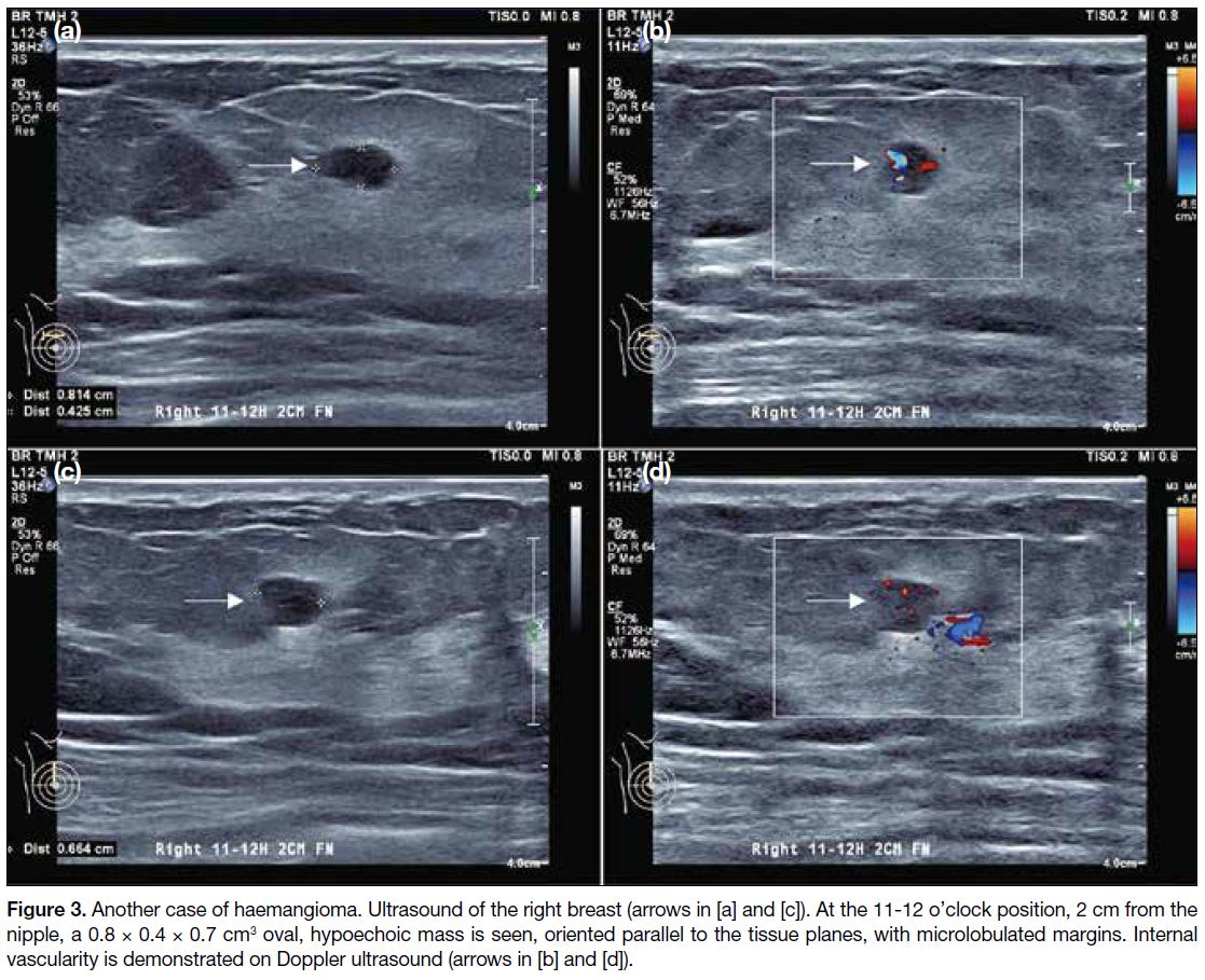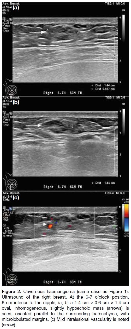 Figure 3. Another case of haemangioma. Ultrasound of the right breast arrows in [a] and [c]. At the 11-12 o’clock position, 2 cm from the nipple, a 0.8