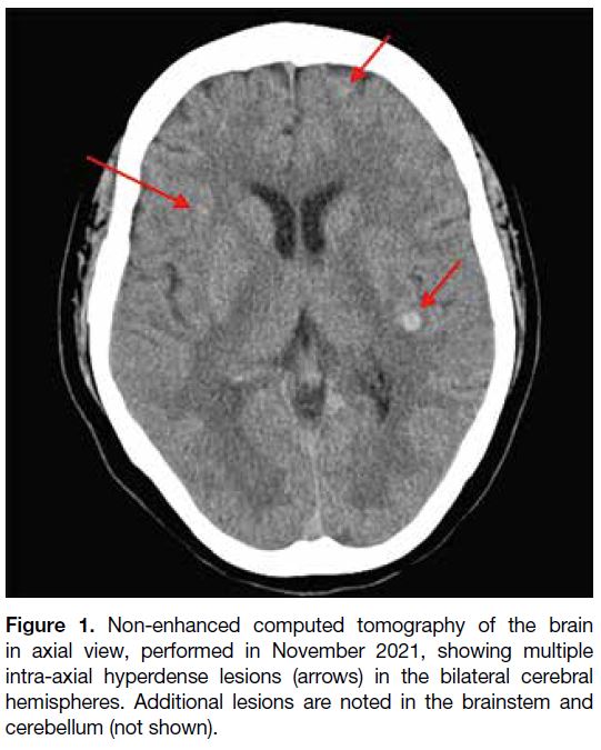 intra-axial hyperdense lesions (arrows) in the bilateral cerebral