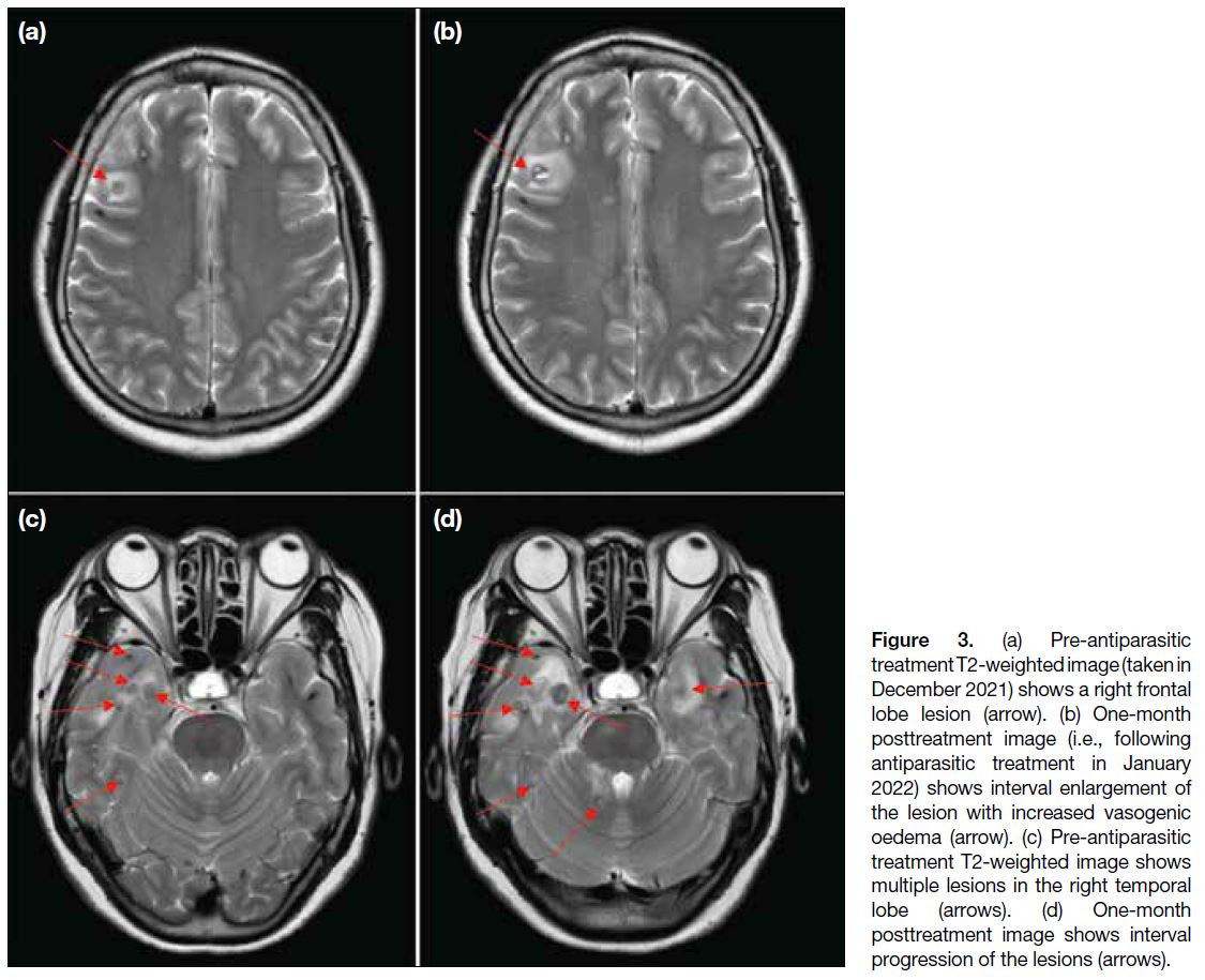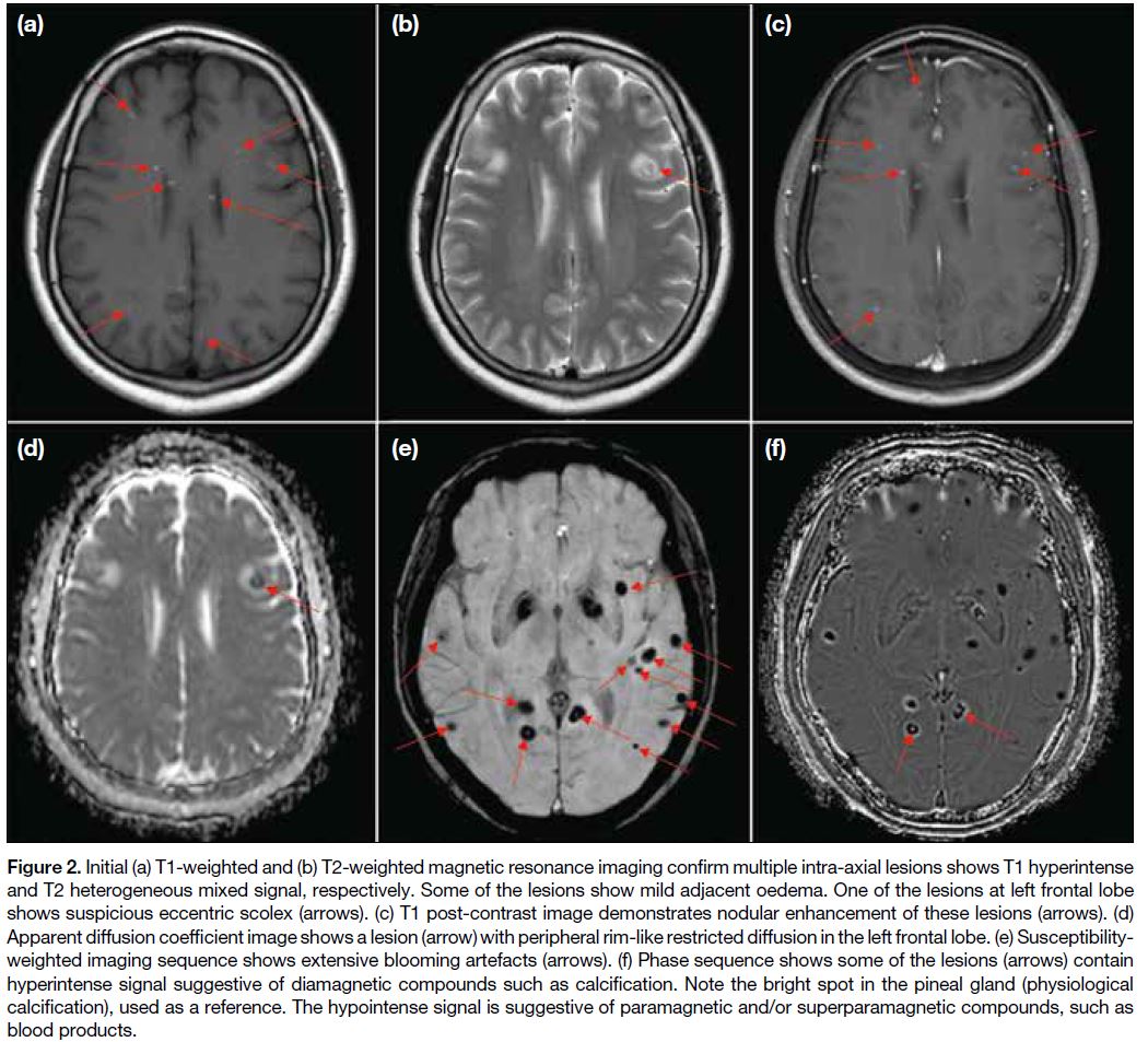 enhancement. One 7-mm lesion in the left frontal lobe demonstrated restricted diffusion and a suspicious eccentric scolex (Figure 2b). In view of the previously