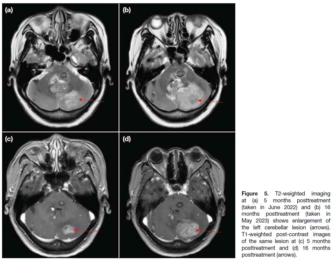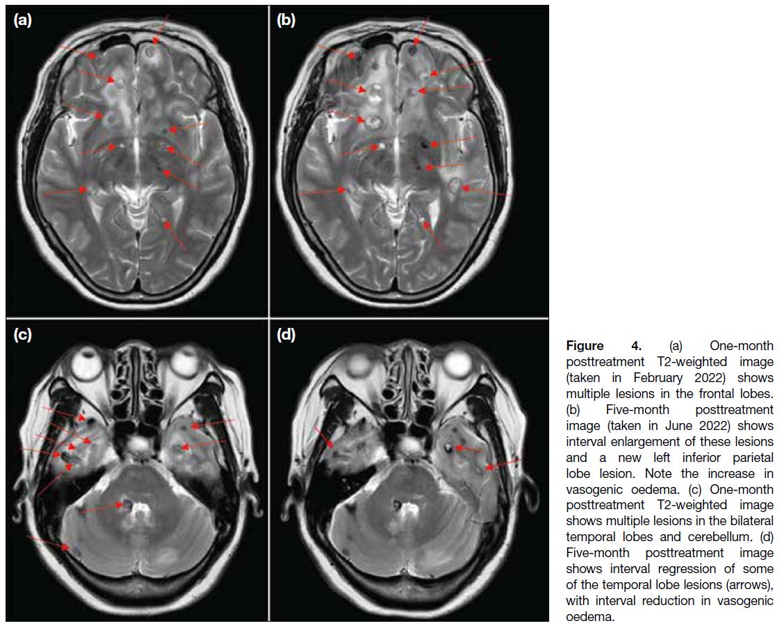A scan at 5 months posttreatment revealed continued progression of some lesions in the bilateral frontal and left inferior parietal lobes (Figure 4a and b), while some lesions in the bilateral temporal lobes had regressed (Figure 4c and d). The overall picture favoured a mixed treatment response.