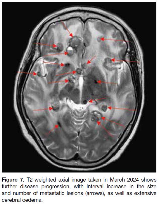 Figure 2. Initial (a) T1-weighted and (b) T2-weighted magnetic resonance imaging confirm multiple intra-axial lesions shows T1 hyperintense