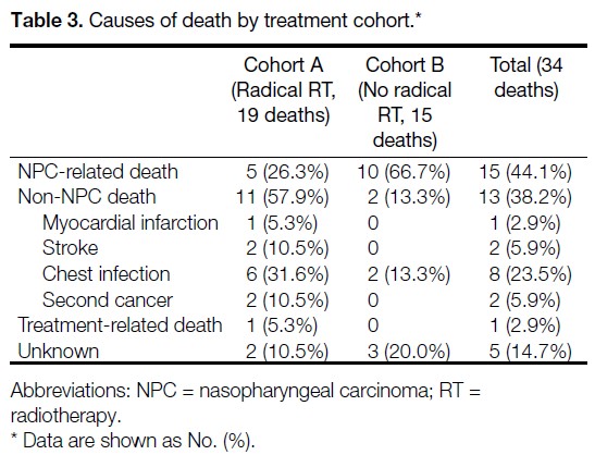 and none survived beyond 5 years. Most deaths in Cohort A (57.9%) were unrelated to NPC, whereas the majority